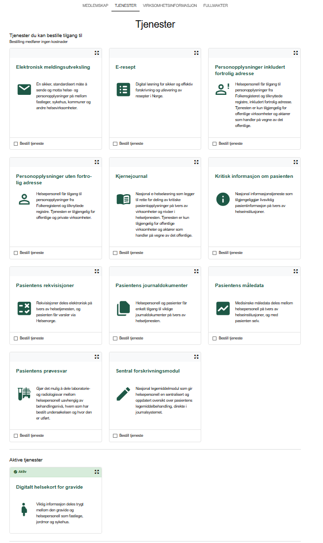 - Bestille tilgang til tjenester (få oversikt over bruksvilkårene, og enkelt signere disse. Det er mulig å bestille flere tjenester samtidig)